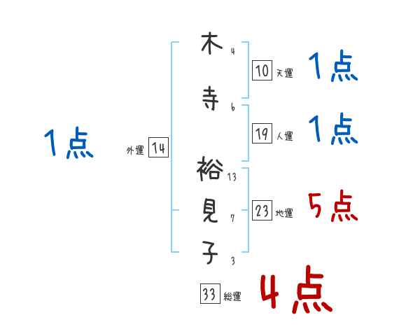 天運![]() | 木寺裕見子さんの天運は10画の1つ星!不安を感じやすい傾向。ストレスを抱えないように注意しましょう。 家系が持つ宿命的な運勢を表します。祖先から受け継いだ苗字ですので自分の力が及びません。家柄を象徴します。 |