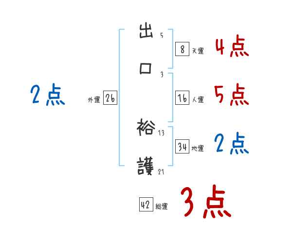 人運![]() | 出口裕護さんの人運は16画の5つ星!人望が厚く大きく発展する。逆転成功が見える。 性格や才能などを表す2番目に重要な運勢です。人間関係や協調性、社会的な成功に影響します。主に20歳から50歳ぐらいまでの中年期の運勢を表します。 |