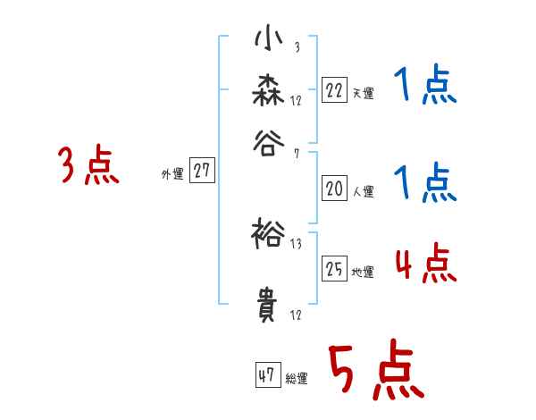 天運![]() | 小森谷裕貴さんの天運は22画の1つ星!努力することが苦手ないっぽう手先が器用。芸術性にも優れる。 家系が持つ宿命的な運勢を表します。祖先から受け継いだ苗字ですので自分の力が及びません。家柄を象徴します。 |