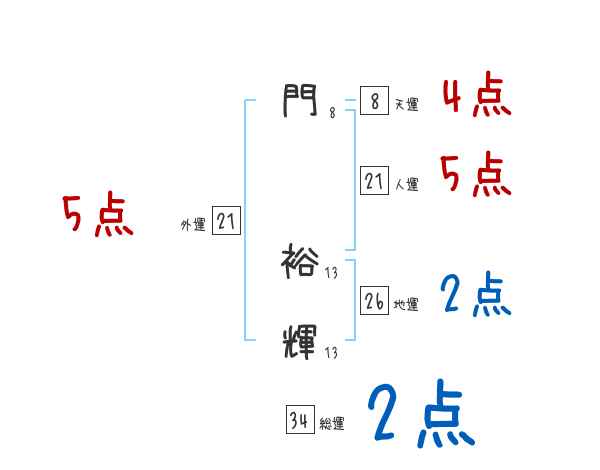 人運![]() | 門裕輝さんの人運は21画の5つ星!統率力がある。独立し成功する。名誉を手に入れる。 性格や才能などを表す2番目に重要な運勢です。人間関係や協調性、社会的な成功に影響します。主に20歳から50歳ぐらいまでの中年期の運勢を表します。 |