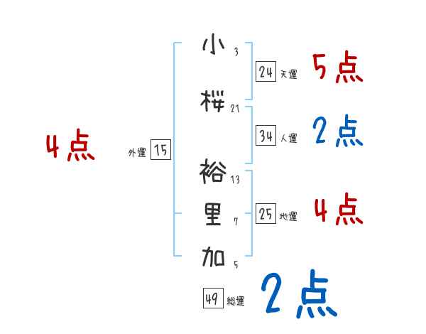天運![]() | 小桜裕里加さんの天運は24画の5つ星!家庭運が良く順調な人生。金運にも恵まれる。 家系が持つ宿命的な運勢を表します。祖先から受け継いだ苗字ですので自分の力が及びません。家柄を象徴します。 |