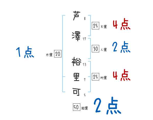 天運![]() | 芦澤裕里可さんの天運は25画の4つ星!個性があり才能があふれる。強運の持ち主で発展する。 家系が持つ宿命的な運勢を表します。祖先から受け継いだ苗字ですので自分の力が及びません。家柄を象徴します。 |