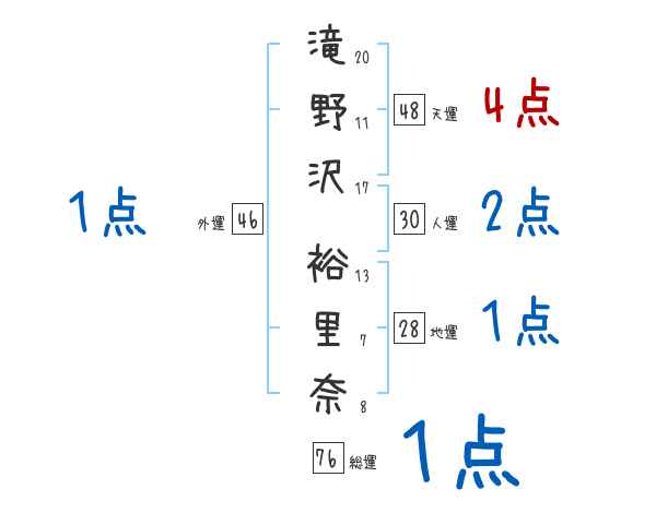 総運![]() | 滝野沢裕里奈さんの総運は76画の1つ星!離散に注意。劣等感を感じ孤立しやすい傾向があるかも。 あなたの人生を表す1番重要な運勢です。生涯を通じて影響する総合運となり、主に50歳以降の晩年期に影響を及ぼします。 |