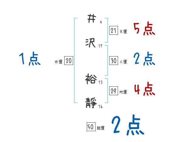 総運![]() | 井沢裕靜さんの総運は50画の2つ星!浮き沈みが激しく不安定。しりすぼみに衰退しやすいので注意しましょう。 あなたの人生を表す1番重要な運勢です。生涯を通じて影響する総合運となり、主に50歳以降の晩年期に影響を及ぼします。 |