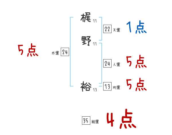 総運![]() | 梶野裕さんの総運は35画の4つ星!温厚な性格で感受性が高い。穏和な性格で人望が厚い。 あなたの人生を表す1番重要な運勢です。生涯を通じて影響する総合運となり、主に50歳以降の晩年期に影響を及ぼします。 |