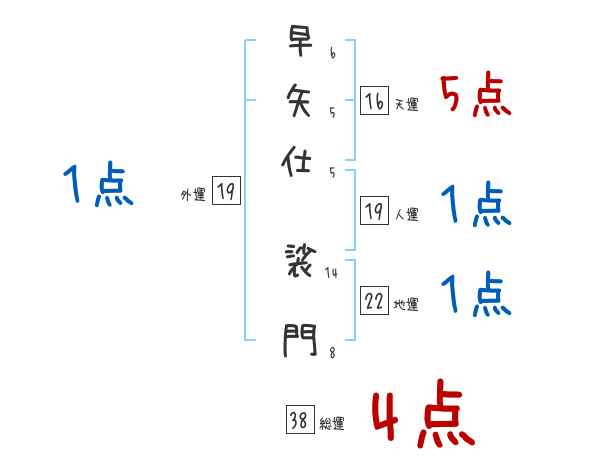 天運![]() | 早矢仕裟門さんの天運は16画の5つ星!人望が厚く大きく発展する。逆転成功が見える。 家系が持つ宿命的な運勢を表します。祖先から受け継いだ苗字ですので自分の力が及びません。家柄を象徴します。 |