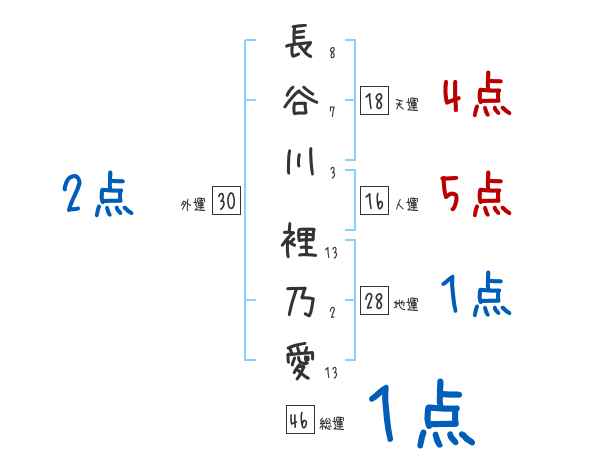 総運![]() | 長谷川裡乃愛さんの総運は46画の1つ星!迷走することが多く苦労するかも。目先のことにとらわれないように。 あなたの人生を表す1番重要な運勢です。生涯を通じて影響する総合運となり、主に50歳以降の晩年期に影響を及ぼします。 |