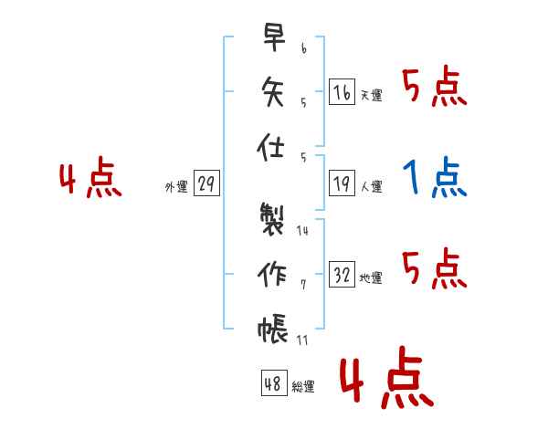 天運![]() | 早矢仕製作帳さんの天運は16画の5つ星!人望が厚く大きく発展する。逆転成功が見える。 家系が持つ宿命的な運勢を表します。祖先から受け継いだ苗字ですので自分の力が及びません。家柄を象徴します。 |