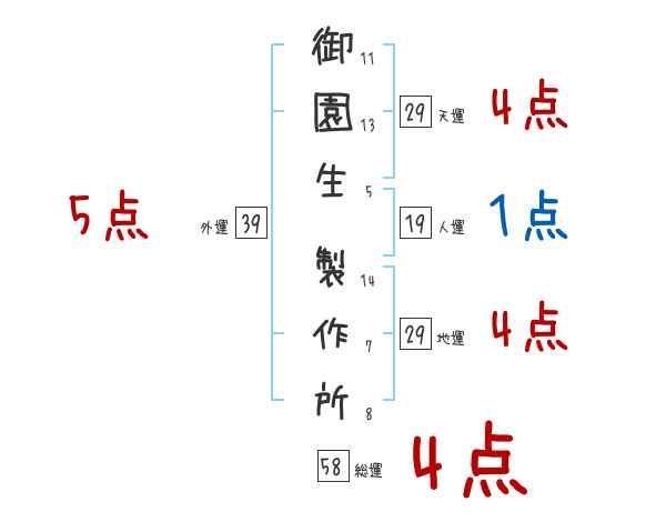 総運![]() | 御園生製作所さんの総運は58画の4つ星!安定した生活。大器晩成タイプ。 あなたの人生を表す1番重要な運勢です。生涯を通じて影響する総合運となり、主に50歳以降の晩年期に影響を及ぼします。 |