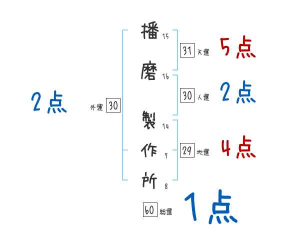 外運![]() | 播磨製作所さんの外運は30画の2つ星!浮き沈みの激しさに注意しましょう。 生活面を象徴する運勢です。外部から受ける影響力を表し、結婚運、家庭運や職場、環境への順応性を表します。 |