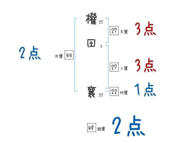 外運![]() | 權田襄さんの外運は44画の2つ星!誠実で慎重な性格。物事を考えすぎないように注意しましょう。 生活面を象徴する運勢です。外部から受ける影響力を表し、結婚運、家庭運や職場、環境への順応性を表します。 |