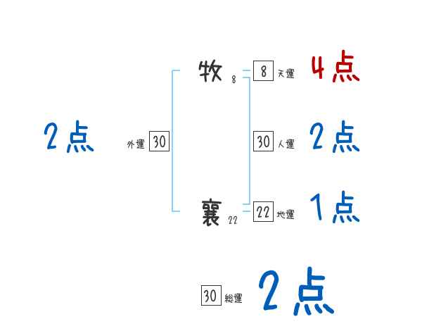 天運![]() | 牧襄さんの天運は8画の4つ星!勤勉家。根気強く努力し成功する。忍耐力がある。 家系が持つ宿命的な運勢を表します。祖先から受け継いだ苗字ですので自分の力が及びません。家柄を象徴します。 |