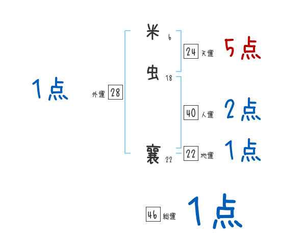総運![]() | 米虫襄さんの総運は46画の1つ星!迷走することが多く苦労するかも。目先のことにとらわれないように。 あなたの人生を表す1番重要な運勢です。生涯を通じて影響する総合運となり、主に50歳以降の晩年期に影響を及ぼします。 |