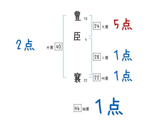天運![]() | 豊臣襄さんの天運は24画の5つ星!家庭運が良く順調な人生。金運にも恵まれる。 家系が持つ宿命的な運勢を表します。祖先から受け継いだ苗字ですので自分の力が及びません。家柄を象徴します。 |