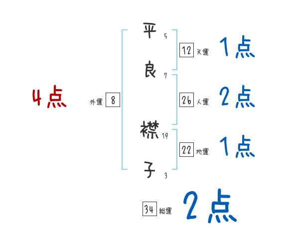 総運![]() | 平良襟子さんの総運は34画の2つ星!独創性に優れるが、自尊心が強く災難に注意しましょう。 あなたの人生を表す1番重要な運勢です。生涯を通じて影響する総合運となり、主に50歳以降の晩年期に影響を及ぼします。 |