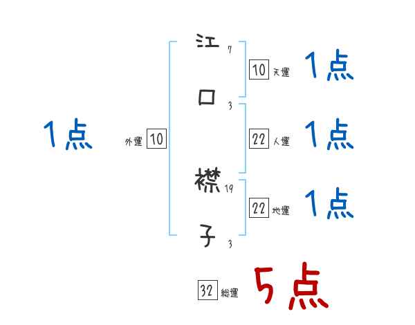 総運![]() | 江口襟子さんの総運は32画の5つ星!柔軟性があり成功する。チャンスが多く金運が良い。 あなたの人生を表す1番重要な運勢です。生涯を通じて影響する総合運となり、主に50歳以降の晩年期に影響を及ぼします。 |