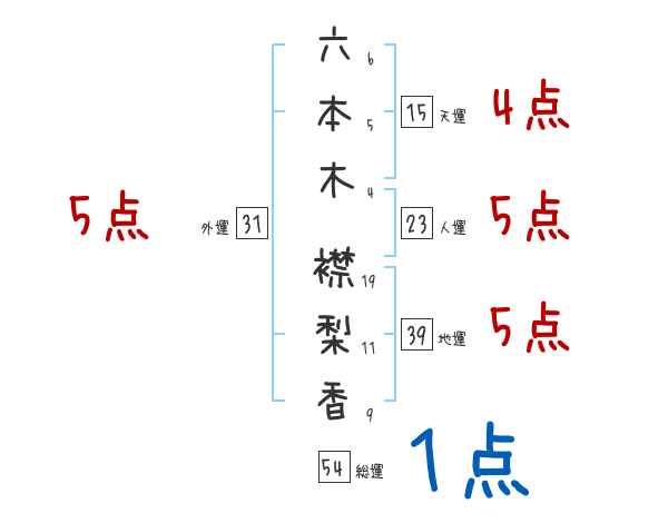 総運![]() | 六本木襟梨香さんの総運は54画の1つ星!トラブルが多いかも。周りをよく見て協調して過ごしましょう。 あなたの人生を表す1番重要な運勢です。生涯を通じて影響する総合運となり、主に50歳以降の晩年期に影響を及ぼします。 |