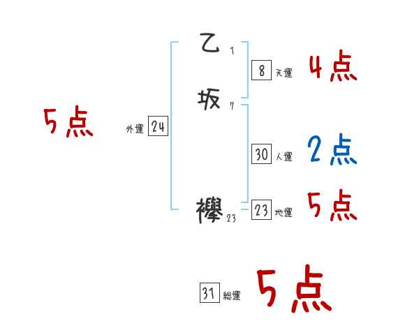 天運![]() | 乙坂襷さんの天運は8画の4つ星!勤勉家。根気強く努力し成功する。忍耐力がある。 家系が持つ宿命的な運勢を表します。祖先から受け継いだ苗字ですので自分の力が及びません。家柄を象徴します。 |