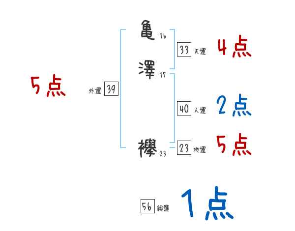 天運![]() | 亀澤襷さんの天運は33画の4つ星!権力志向でプライドが高い。勇気があり運を切り開き成功する。 家系が持つ宿命的な運勢を表します。祖先から受け継いだ苗字ですので自分の力が及びません。家柄を象徴します。 |
