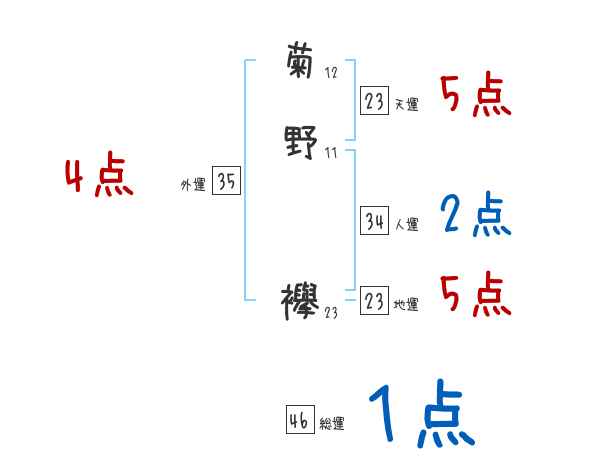 天運![]() | 菊野襷さんの天運は23画の5つ星!想像力に優れ活力がある。一代で成功し名誉を手に入れる。 家系が持つ宿命的な運勢を表します。祖先から受け継いだ苗字ですので自分の力が及びません。家柄を象徴します。 |