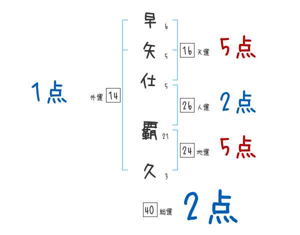 人運![]() | 早矢仕覇久さんの人運は26画の2つ星!波瀾万丈かも。信頼できる人を大事にしましょう。 性格や才能などを表す2番目に重要な運勢です。人間関係や協調性、社会的な成功に影響します。主に20歳から50歳ぐらいまでの中年期の運勢を表します。 |