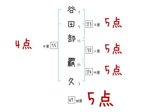 総運![]() | 谷田部覇久さんの総運は47画の5つ星!実力が開花し発展する円満な人生。財に恵まれる。 あなたの人生を表す1番重要な運勢です。生涯を通じて影響する総合運となり、主に50歳以降の晩年期に影響を及ぼします。 |