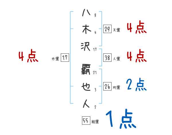 外運![]() | 八木沢覇也人さんの外運は17画の4つ星!積極的な行動力。地位を気づき財産を手に入れる。純粋な心と直感力。 生活面を象徴する運勢です。外部から受ける影響力を表し、結婚運、家庭運や職場、環境への順応性を表します。 |
