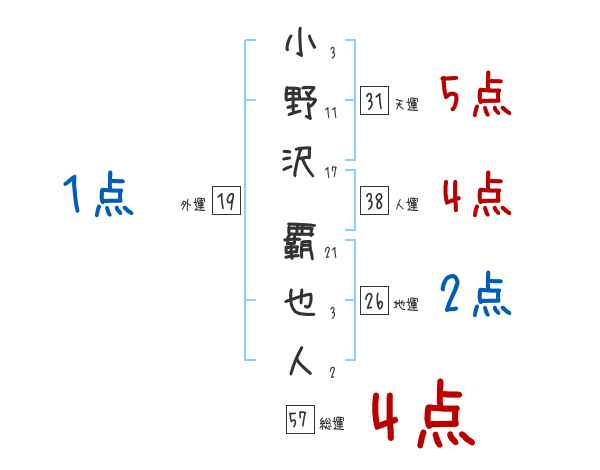 天運![]() | 小野沢覇也人さんの天運は31画の5つ星!社交性があり判断力に優れる。順風満帆な人生で円満な生活。 家系が持つ宿命的な運勢を表します。祖先から受け継いだ苗字ですので自分の力が及びません。家柄を象徴します。 |