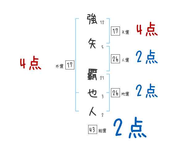 総運![]() | 強矢覇也人さんの総運は43画の2つ星!頑固な性格で独立心が強いかも。やや非現実的で浪費に注意しましょう。 あなたの人生を表す1番重要な運勢です。生涯を通じて影響する総合運となり、主に50歳以降の晩年期に影響を及ぼします。 |
