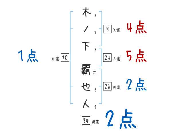 天運![]() | 木ノ下覇也人さんの天運は8画の4つ星!勤勉家。根気強く努力し成功する。忍耐力がある。 家系が持つ宿命的な運勢を表します。祖先から受け継いだ苗字ですので自分の力が及びません。家柄を象徴します。 |