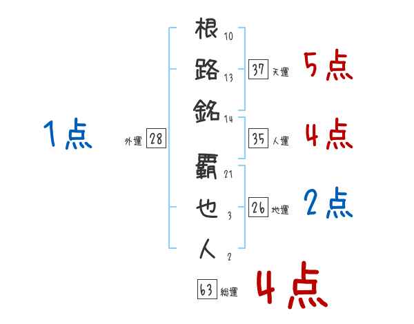 人運![]() | 根路銘覇也人さんの人運は35画の4つ星!温厚な性格で感受性が高い。穏和な性格で人望が厚い。 性格や才能などを表す2番目に重要な運勢です。人間関係や協調性、社会的な成功に影響します。主に20歳から50歳ぐらいまでの中年期の運勢を表します。 |