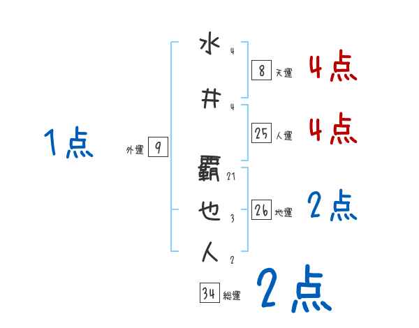 総運![]() | 水井覇也人さんの総運は34画の2つ星!独創性に優れるが、自尊心が強く災難に注意しましょう。 あなたの人生を表す1番重要な運勢です。生涯を通じて影響する総合運となり、主に50歳以降の晩年期に影響を及ぼします。 |