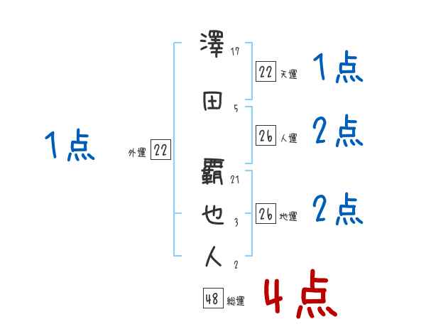 天運![]() | 澤田覇也人さんの天運は22画の1つ星!努力することが苦手ないっぽう手先が器用。芸術性にも優れる。 家系が持つ宿命的な運勢を表します。祖先から受け継いだ苗字ですので自分の力が及びません。家柄を象徴します。 |