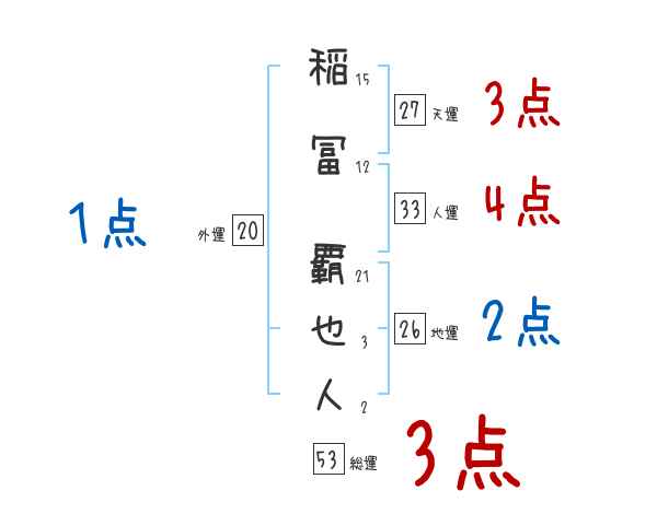 総運![]() | 稲冨覇也人さんの総運は53画の3つ星!やや見栄っ張りで虚栄心がある。散財に注意。 あなたの人生を表す1番重要な運勢です。生涯を通じて影響する総合運となり、主に50歳以降の晩年期に影響を及ぼします。 |