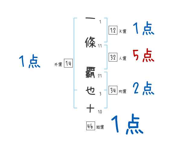 | 総運  | 一條覇也十さんの総運は46画の1つ星!迷走することが多く苦労するかも。目先のことにとらわれないように。あなたの人生を表す1番重要な運勢です。生涯を通じて影響する総合運となり、主に50歳以降の晩年期に影響を及ぼします。 |