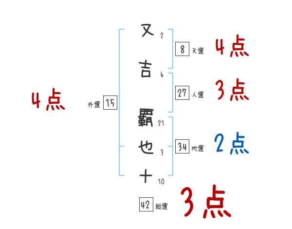 総運![]() | 又吉覇也十さんの総運は42画の3つ星!病気に注意。多芸であるが消極的でおとなしい。 あなたの人生を表す1番重要な運勢です。生涯を通じて影響する総合運となり、主に50歳以降の晩年期に影響を及ぼします。 |