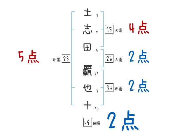 人運![]() | 土志田覇也十さんの人運は26画の2つ星!波瀾万丈かも。信頼できる人を大事にしましょう。 性格や才能などを表す2番目に重要な運勢です。人間関係や協調性、社会的な成功に影響します。主に20歳から50歳ぐらいまでの中年期の運勢を表します。 |