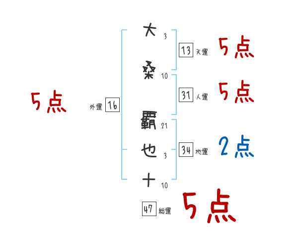 総運![]() | 大桑覇也十さんの総運は47画の5つ星!実力が開花し発展する円満な人生。財に恵まれる。 あなたの人生を表す1番重要な運勢です。生涯を通じて影響する総合運となり、主に50歳以降の晩年期に影響を及ぼします。 |
