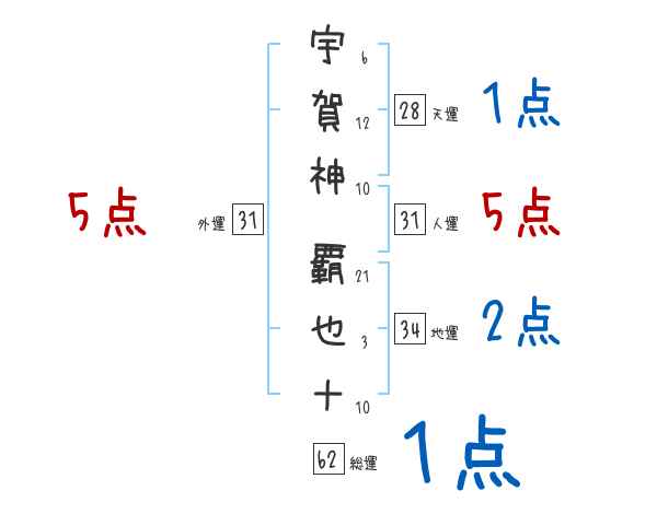 天運![]() | 宇賀神覇也十さんの天運は28画の1つ星!家庭環境に注意。スポーツで活躍できる能力があるかも。 家系が持つ宿命的な運勢を表します。祖先から受け継いだ苗字ですので自分の力が及びません。家柄を象徴します。 |