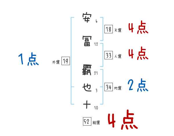 外運![]() | 安冨覇也十さんの外運は19画の1つ星!優れた才能を持ちますが、協調性が足りないことも。周りの人と協力する事を意識しましょう。 生活面を象徴する運勢です。外部から受ける影響力を表し、結婚運、家庭運や職場、環境への順応性を表します。 |