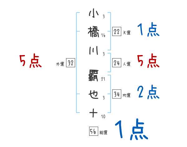 外運![]() | 小橋川覇也十さんの外運は32画の5つ星!柔軟性があり成功する。チャンスが多く金運が良い。 生活面を象徴する運勢です。外部から受ける影響力を表し、結婚運、家庭運や職場、環境への順応性を表します。 |