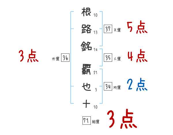 外運![]() | 根路銘覇也十さんの外運は36画の3つ星!先見性が豊かです。多少神経質で苦労することも。 生活面を象徴する運勢です。外部から受ける影響力を表し、結婚運、家庭運や職場、環境への順応性を表します。 |