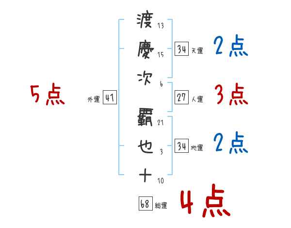 総運![]() | 渡慶次覇也十さんの総運は68画の4つ星!潜在能力が高く集中力が高い。勤勉に励み発展する。 あなたの人生を表す1番重要な運勢です。生涯を通じて影響する総合運となり、主に50歳以降の晩年期に影響を及ぼします。 |