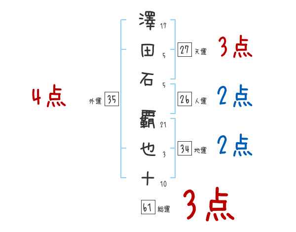 外運![]() | 澤田石覇也十さんの外運は35画の4つ星!温厚な性格で感受性が高い。穏和な性格で人望が厚い。 生活面を象徴する運勢です。外部から受ける影響力を表し、結婚運、家庭運や職場、環境への順応性を表します。 |