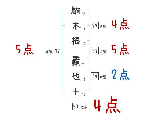 総運![]() | 駒木根覇也十さんの総運は63画の4つ星!家庭運がよく順調な生活。温和な性格。 あなたの人生を表す1番重要な運勢です。生涯を通じて影響する総合運となり、主に50歳以降の晩年期に影響を及ぼします。 |