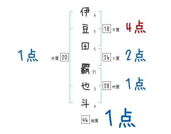 天運![]() | 伊豆田覇也斗さんの天運は18画の4つ星!情熱的で剛気。忍耐力があり信頼される。 家系が持つ宿命的な運勢を表します。祖先から受け継いだ苗字ですので自分の力が及びません。家柄を象徴します。 |