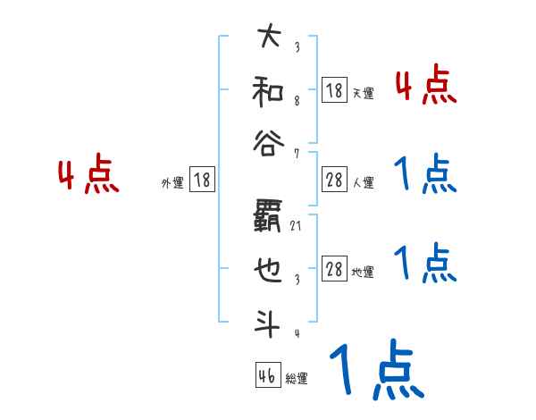 外運![]() | 大和谷覇也斗さんの外運は18画の4つ星!情熱的で剛気。忍耐力があり信頼される。 生活面を象徴する運勢です。外部から受ける影響力を表し、結婚運、家庭運や職場、環境への順応性を表します。 |