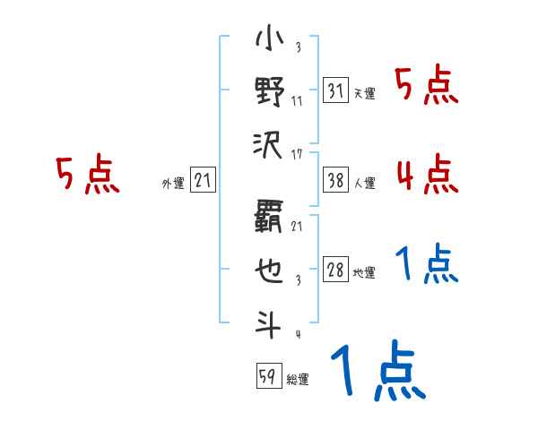 外運![]() | 小野沢覇也斗さんの外運は21画の5つ星!統率力がある。独立し成功する。名誉を手に入れる。 生活面を象徴する運勢です。外部から受ける影響力を表し、結婚運、家庭運や職場、環境への順応性を表します。 |
