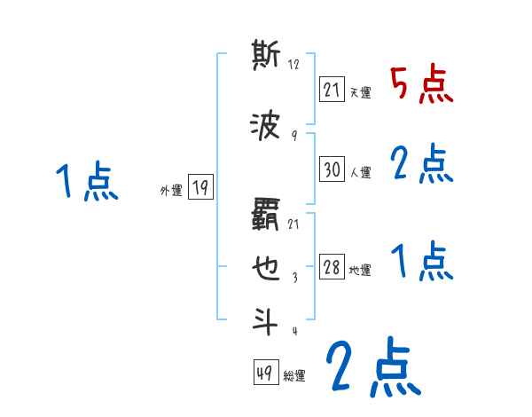 天運![]() | 斯波覇也斗さんの天運は21画の5つ星!統率力がある。独立し成功する。名誉を手に入れる。 家系が持つ宿命的な運勢を表します。祖先から受け継いだ苗字ですので自分の力が及びません。家柄を象徴します。 |