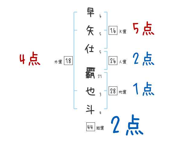 総運![]() | 早矢仕覇也斗さんの総運は44画の2つ星!誠実で慎重な性格。物事を考えすぎないように注意しましょう。 あなたの人生を表す1番重要な運勢です。生涯を通じて影響する総合運となり、主に50歳以降の晩年期に影響を及ぼします。 |